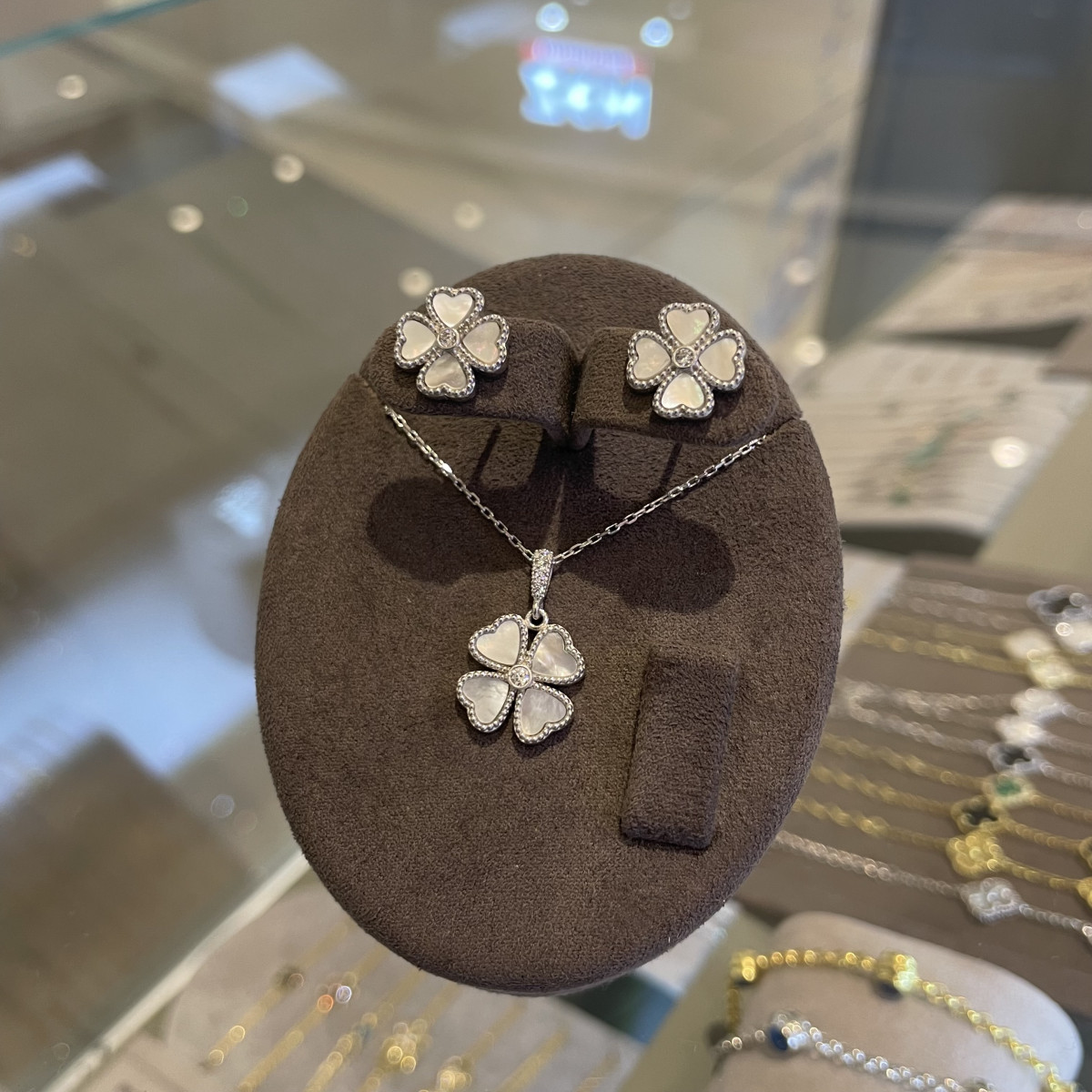 925 ayar gümüşten oluşan kolye ve küpe ikili settir.